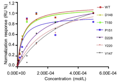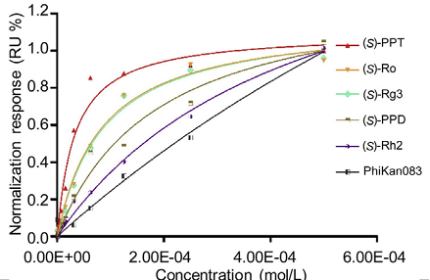 该课题组使用亲和质谱与Biacore联用的方式开展了相关探究。经亲和质谱分析,该团队从人参皂苷的粗提物中,找到了潜在21个作用组分;随后,使用Biacore的Binding level screen实验模块开展了片段筛选实验(Fragmentlibrary screening),该团队从binding level (>20 RU)、RSD (<30%)、P (<0.05)多个维度,筛选出15个潜在作用组分。随后,研究人员使用Biacore对其中5个高潜作用组分进行了Affinity screen。结果表明:这些高潜作用组分与P53的亲和力都要强于已知的稳定剂PhiKan083;其中,(S)-PPT与P53的亲和力最强。
