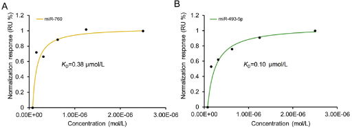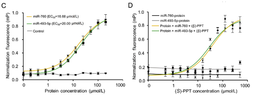 最后使用Biacore与荧光共振技术联用的方式,进一步确认了(S)-PPT发挥抗肿瘤效果的作用方式。使用Biacore实验,证实了P53与相关信号通路中上调基因(miR-760)、下调基因(miR-493-5p)均存在较强结合,证实了P53在相关信号通路中的重要性。此外,荧光共振的实验结果也表明(S)-PPT分子对P53-DNA的相互作用有促进效果。