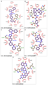 图A筛选化合物亲和力排序 图B 3D相互作用图 图C 2D相互作用图 图D 动力学模拟结合稳定性