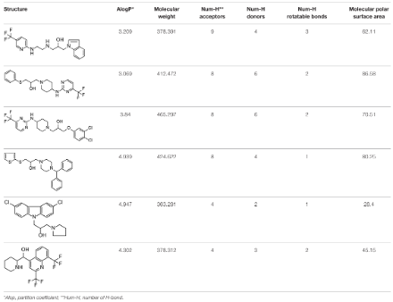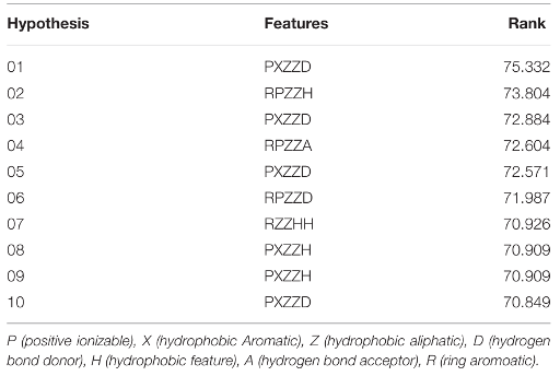 生成10个HipHop模型后,用活性和非活性氨基醇组成的测试集来选择最佳模型,其中药效团模型HipHop-Hypo03最佳。该药效团包括一个PI基团、一个HAR基团、两个HAL基团和一个HBD基团。