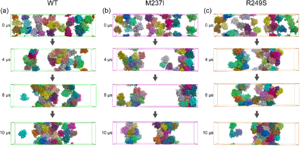 为了探索M237I/R249S突变对p53C相分离行为的影响,研究者通过Martini 3(粗粒化模拟中的一种力场)粗粒化模型模拟了p53C野生型(WT)及两个突变体(M237I和R249S)的自发LLPS过程,模拟的时间为10微秒(μs)。