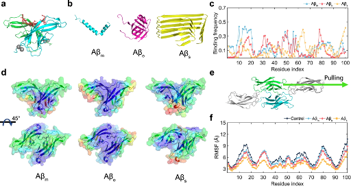 每一研究体系通过40个50ns动力学模拟,探究Aβ物种(单体、寡聚体和种子)与VE-cadherin二聚体的结合方式。Aβ寡聚体(Aβo)优先结合到VE-cadherin二聚体的转折区;Aβ种子(Aβs)主要与二聚体的C端结合;Aβ单体(Aβm)则在二聚体的整个区域都有较均匀的结合。每一研究体系通过70个100ns的拉伸分子动力学(拉力精度和范围分别为10pN和(0, 60)pN),揭示Aβ如何通过不同的结合行为,影响VE-cadherin二聚体的结构和稳定性。结果表明Aβo和Aβs在模拟中引起了较早的二聚体解离,且Aβ寡聚体对VE-cadherin的稳定性破坏最为显著。图3 j为Aβo的结构变化图,图3 k为Aβs的结构变化图。