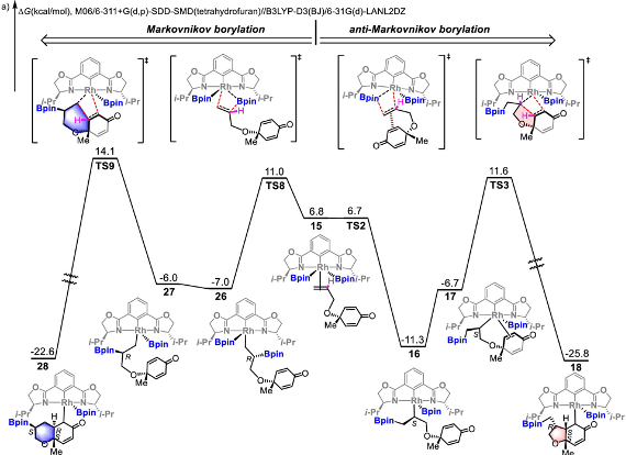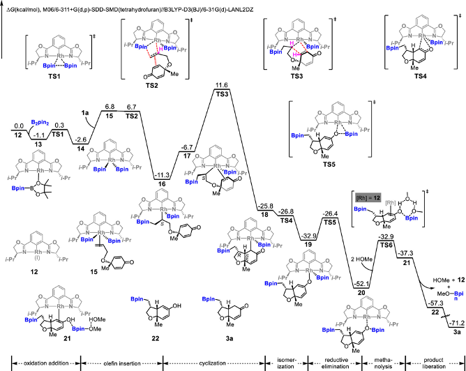 本研究实现铑(III)催化的环己二烯酮连接的烯烃(1,6-二烯)与B2pin2之间的不对称硼基化环化,生成了具有三个或四个相邻立体中心的光学纯顺式氢化苯并呋喃骨架。DFT计算的反应机理揭示了一个涉及双硼基铑(III)中间体的Rh(I)–Rh(III)催化循环。该反应通过烯烃插入、共轭加成和随后的还原消除步骤进行,其中,环化共轭加成是决定区域选择性的关键步骤。主要结果如下【1】