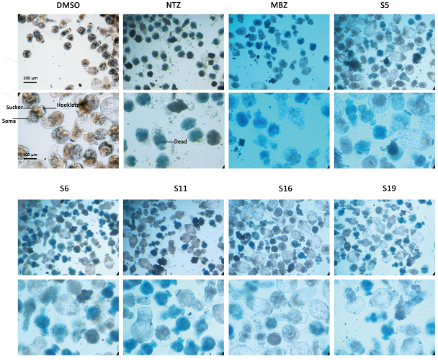 对E. multilocularis PSCs的体外活性及其细胞毒性10种化合物致使寄生虫在3天内100%死亡,它们的LC50值为16.99-20.45 μM。暴露于这些化合物会导致寄生虫的形态损伤(图2) 。此外,化合物S6、 S11. S16和S19的细胞毒性低,且S5、 S6、 S11、 S16、 S19、 S28能抑制癌细胞(A172细胞)的增殖。