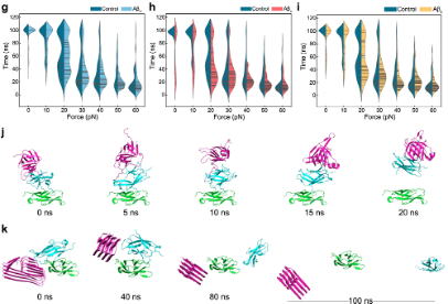 每一研究体系通过40个50ns动力学模拟,探究Aβ物种(单体、寡聚体和种子)与VE-cadherin二聚体的结合方式。Aβ寡聚体(Aβo)优先结合到VE-cadherin二聚体的转折区;Aβ种子(Aβs)主要与二聚体的C端结合;Aβ单体(Aβm)则在二聚体的整个区域都有较均匀的结合。每一研究体系通过70个100ns的拉伸分子动力学(拉力精度和范围分别为10pN和(0, 60)pN),揭示Aβ如何通过不同的结合行为,影响VE-cadherin二聚体的结构和稳定性。结果表明Aβo和Aβs在模拟中引起了较早的二聚体解离,且Aβ寡聚体对VE-cadherin的稳定性破坏最为显著。图3 j为Aβo的结构变化图,图3 k为Aβs的结构变化图。